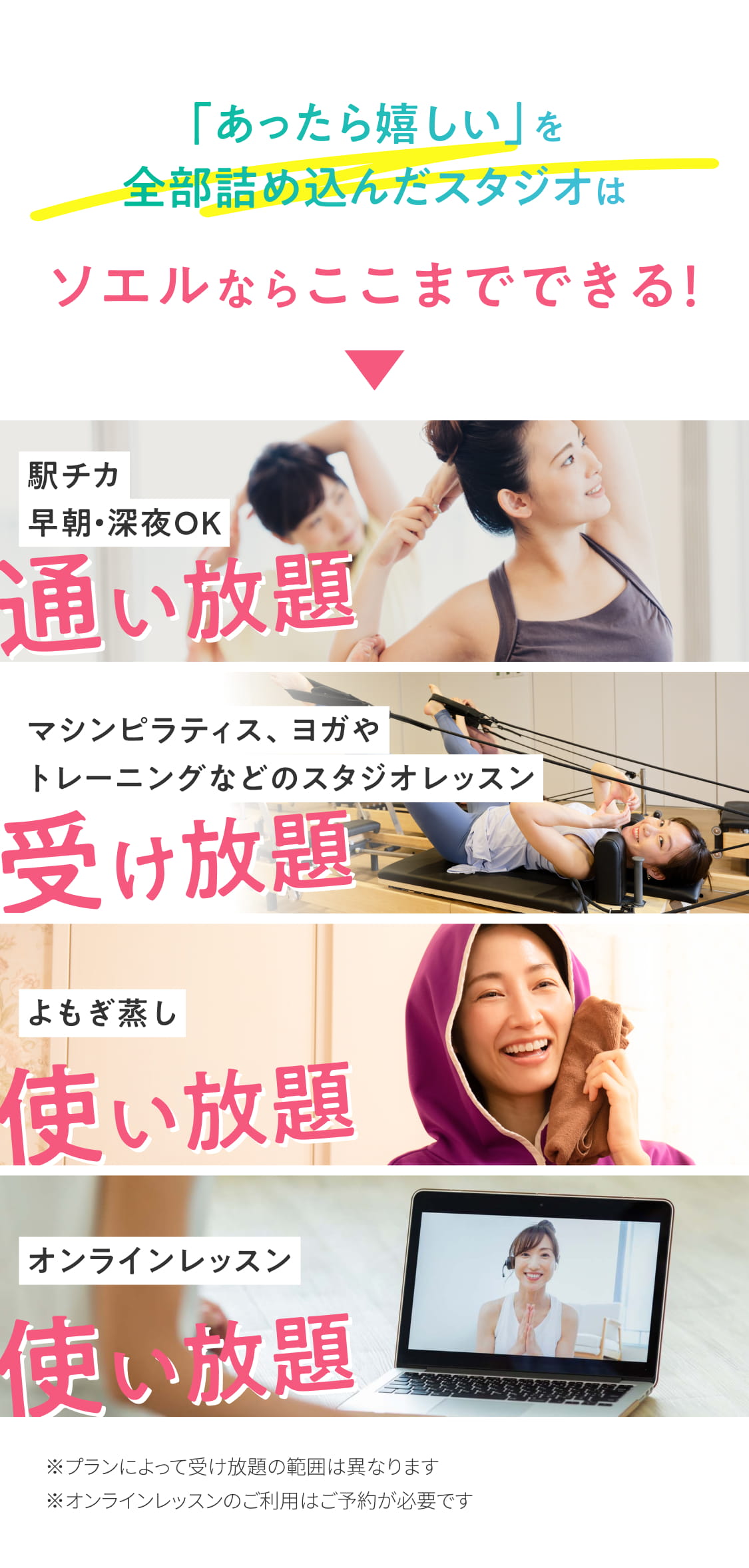 スタジオレッスン・よもぎ蒸し・オンラインレッスンが受け放題・マシンピラティスレッスンは月4回まで受講可能