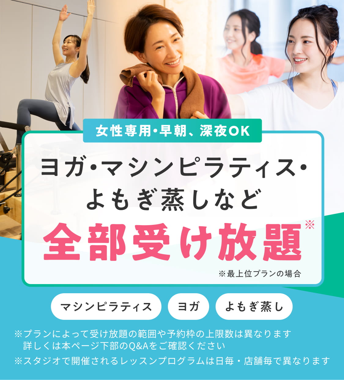 スタジオレッスン・よもぎ蒸し・オンラインレッスンが受け放題・マシンピラティスレッスンは都度チケット購入(税込1,500円)にて受講可能