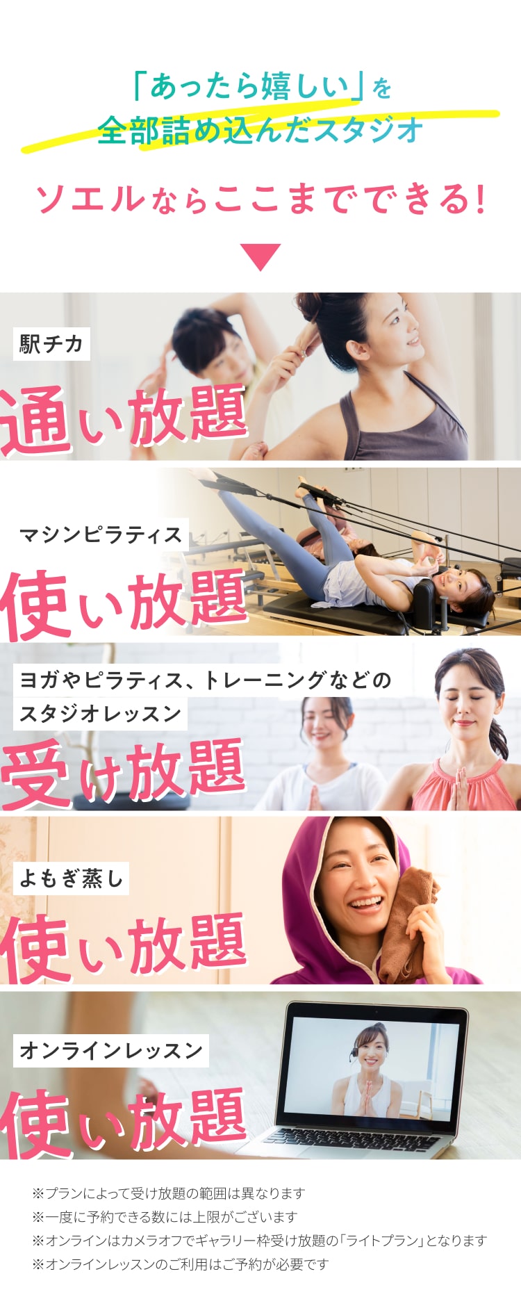 通常価格2,980円(税込3,278円)のライトプラン、スタジオレッスンとオンラインレッスンが受け放題の6,980円(税込7,678円)のスタンダードプラン、さらにマシンピラティスやよもぎ蒸しを含む全てのサービスが受け放題の9,980円(税込10,978円)のプレミアムプランがございます。