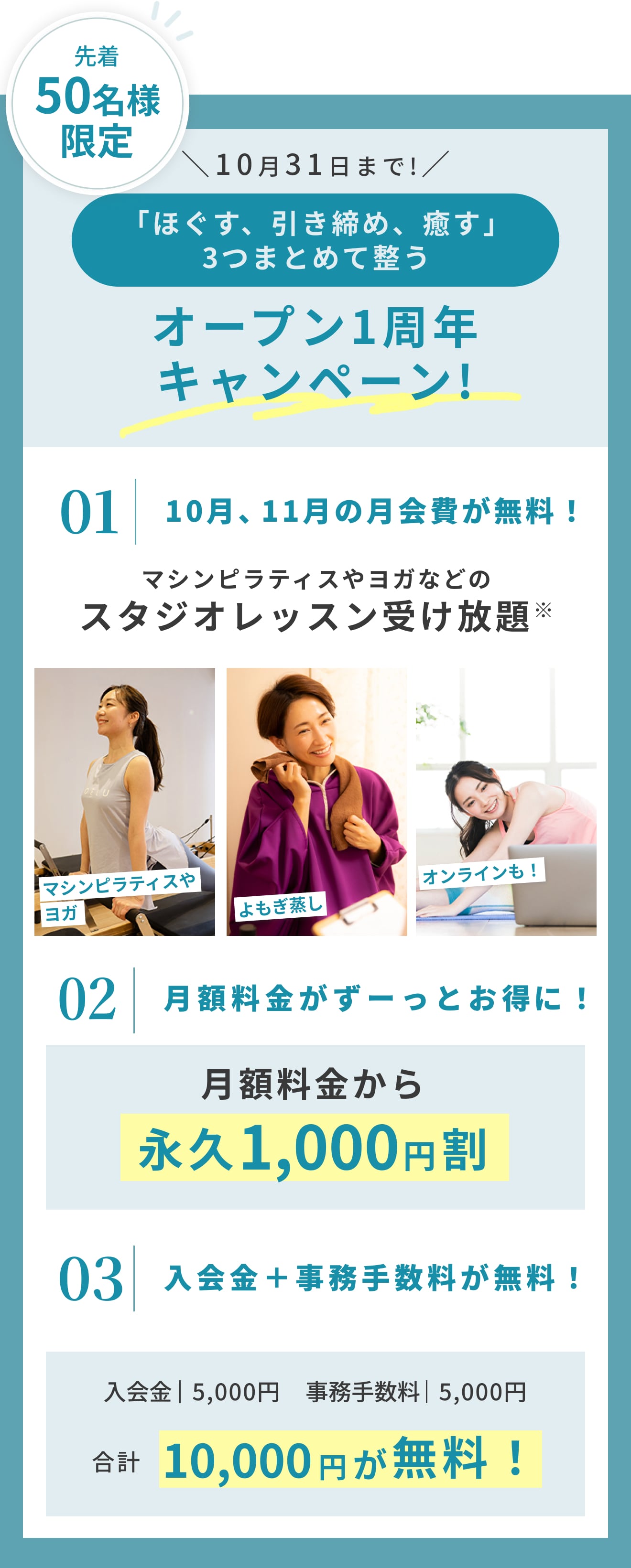 通常価格2,980円(税込3,278円)のライトプラン、スタジオレッスンとオンラインレッスンが受け放題の6,980円(税込7,678円)のスタンダードプラン、さらにマシンピラティスやよもぎ蒸しを含む全てのサービスが受け放題の9,980円(税込10,978円)のプレミアムプランがございます。