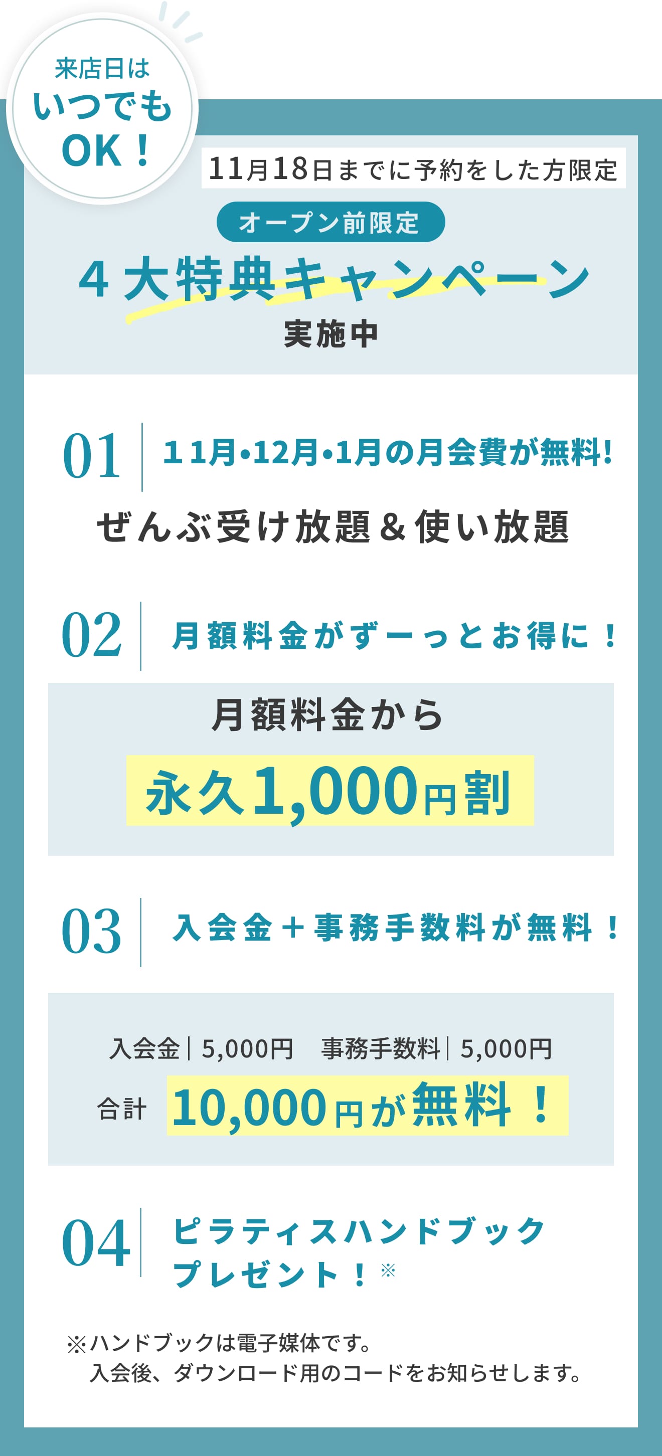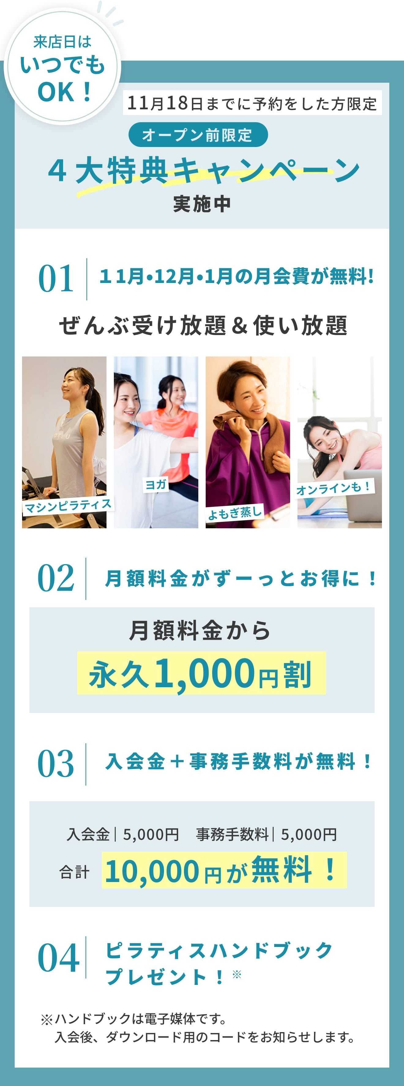 スタジオレッスンとオンラインレッスンが受け放題の6,980円(税込7,678円)のスタンダードプラン、マシンピラティスやよもぎ蒸しを含む全てのサービスが受け放題の9,980円(税込10,978円)のプレミアムプランがございます。