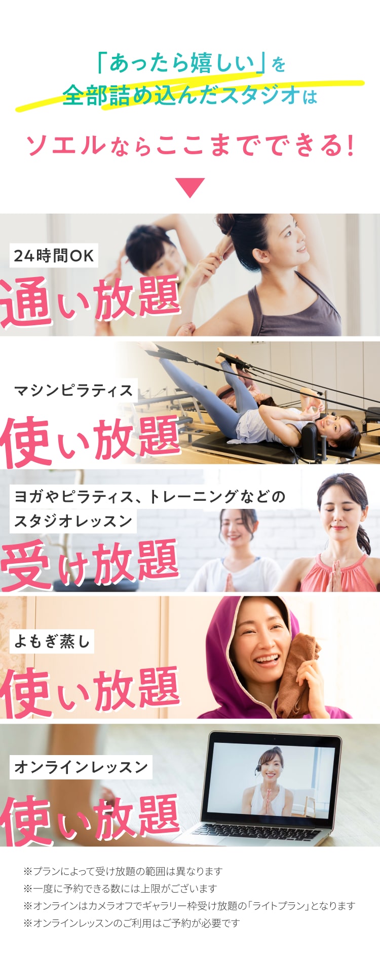 スタジオレッスン・よもぎ蒸し・オンラインレッスンが受け放題・マシンピラティスレッスンは月4回まで受講可能
